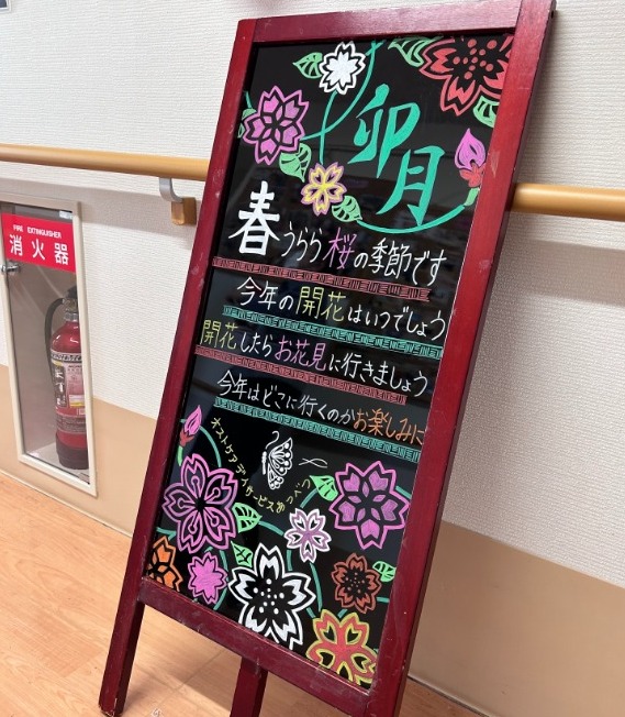 デイサービスではもうすぐ桜の時期ということもあり、お花見の予定を立てているそうで、素敵な看板が置いてありました。