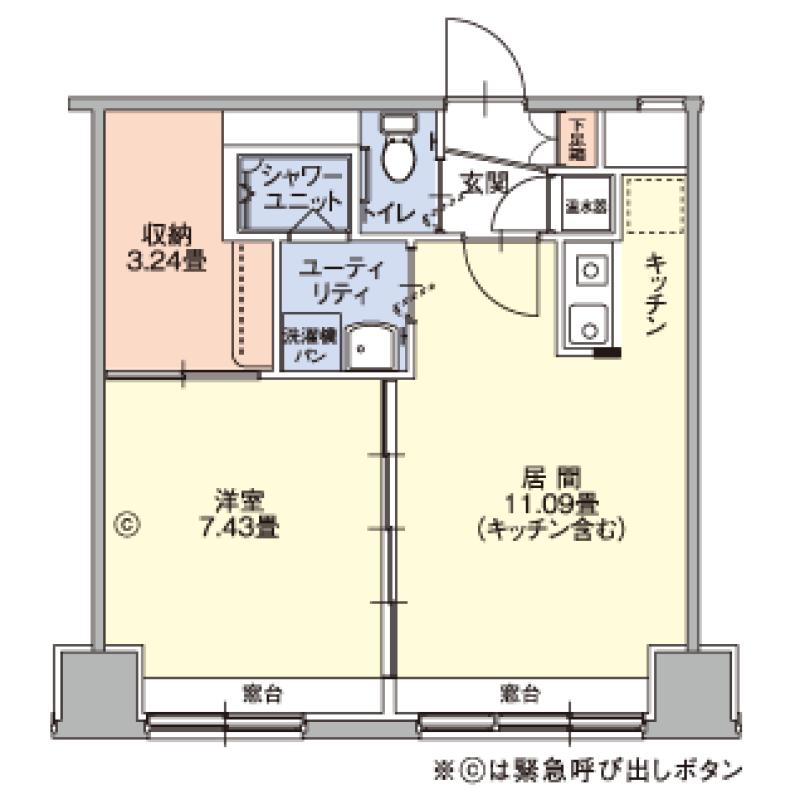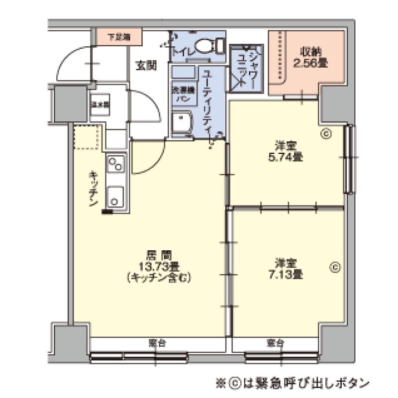 キッチン、照明、電磁調理器、電気パネルヒーター、電気温水器、収納、下足入れ、洗面、シャワー室、トイレ(ウォシュレット付)、緊急呼び出しボタン