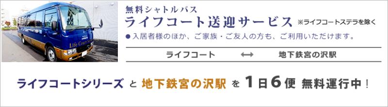 【病院・地下鉄駅への無料送迎サービス】タナカメディカルグループの病院への通院の際は、無料で送迎いたします。各ライフコートシリーズと地下鉄「宮の沢駅」間を結ぶ無料シャトルバスも毎日運行中です。