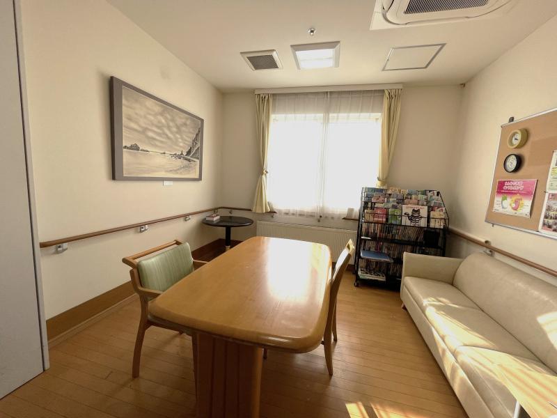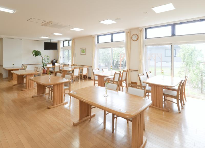 陽ざしが注ぐリビングは広めのスペースで、みなさまでお食事や会話を愉しむくつろぎの空間となっています。カラオケで懐かしの曲などを歌ったり、施設で企画のイベントを楽しんだりと、いきいきのびのびとした時間をお過ごしいただけます。