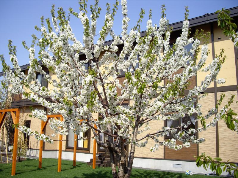 芝生の中庭は当施設自慢の癒しの広場となっています。東屋でのんびりと、自然を感じながらティータイムをお過ごしいた だけます。 春には綺麗なさくらんぼの花が咲き、夏にはさくらんぼ狩りを楽しむことができます。