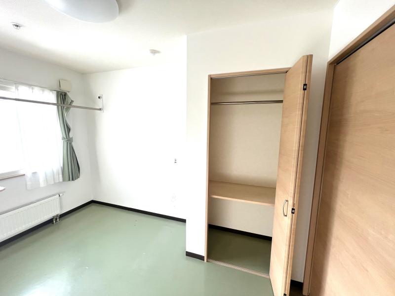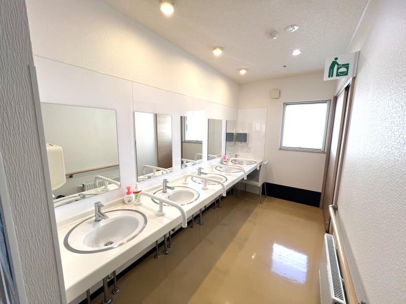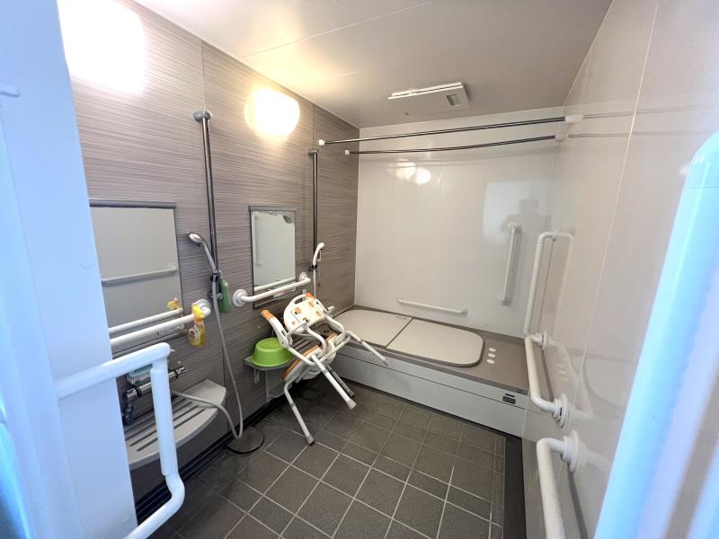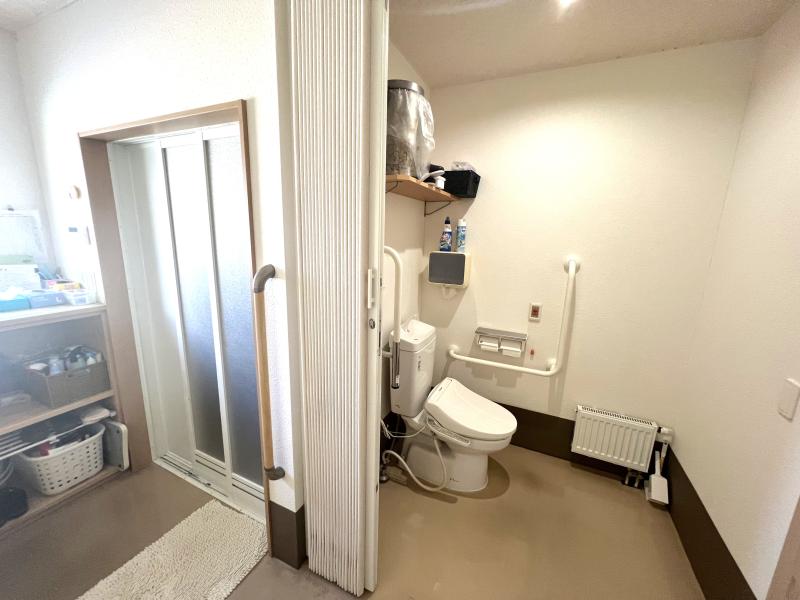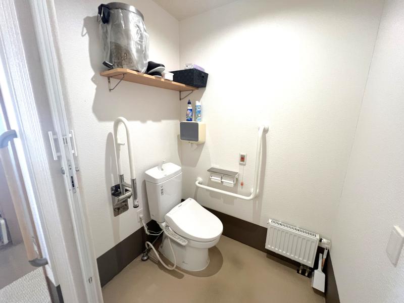 車椅子の方も快適に過ごせるよう、トイレ・洗面コーナーは広いスペースの造りです。また、ADLが低下した場合に転倒防止を考慮し、直ぐに両手が付く範囲に手すり・家具・壁が配置でき、生活空間として不便のない居室空間になってます。