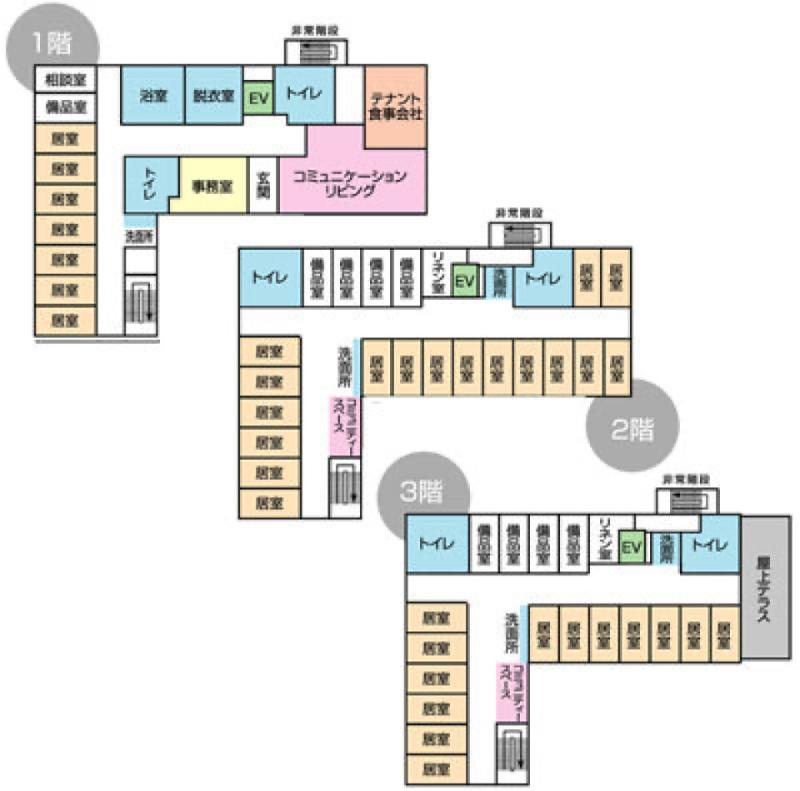 大型エレベーター、浴場、洗濯室、コミュニティリビング、談話コーナー、各階トイレ・洗面所、各所手摺り、全館冷暖房、スプリンクラー、来客用駐車場