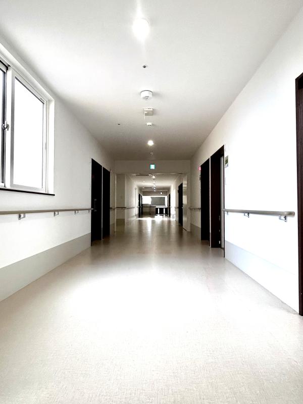 車椅子でも快適にお過ごしいただけるバリアフリー構造です。居室は個室でご自由に家具をお持ち込みいただけます。各階にトイレ付居室が8室あります。広々とした共有スペースを設置し、廊下幅も広く、開放的なアットホームな雰囲気を感じさせる造りです。