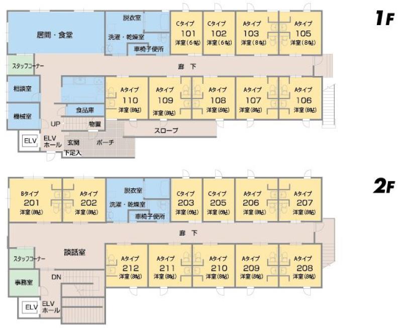 居間・食堂、車椅子対応トイレ、洗面台、浴室、洗濯・乾燥室、エレベーター、談話室、相談室、事務室、食品庫