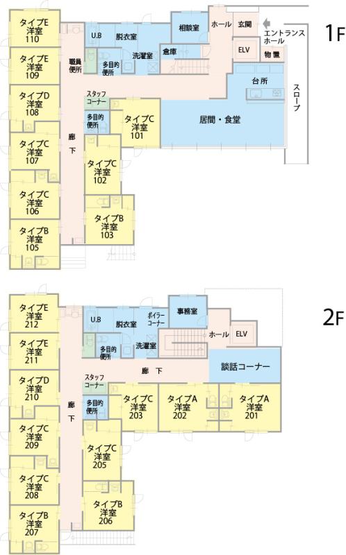 居間・食堂、車椅子対応トイレ、洗面台、浴室、台所、洗濯・乾燥室、エレベーター、談話室、相談室、事務室、食品庫