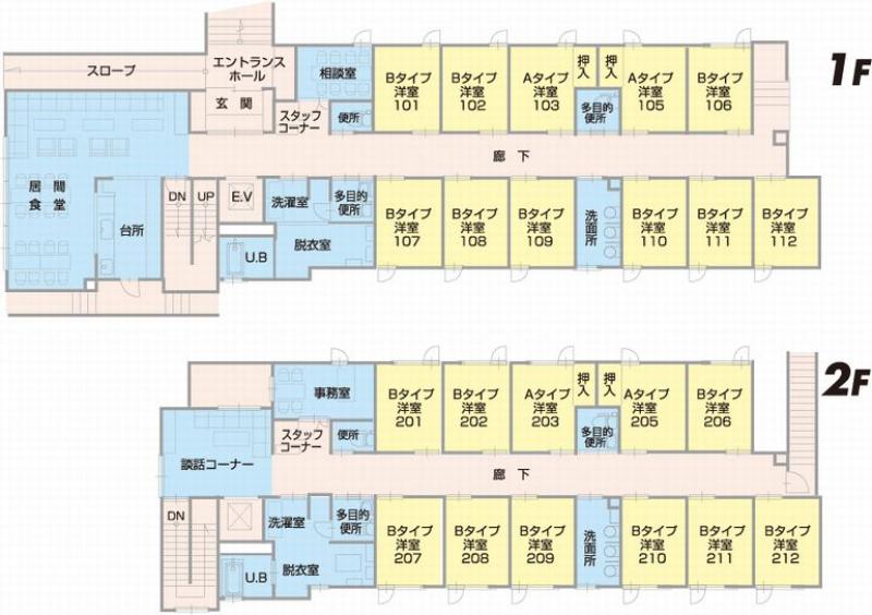 居間・食堂、車椅子対応トイレ、洗面台、浴室、台所、洗濯室、エレベーター、談話室、相談室、事務室