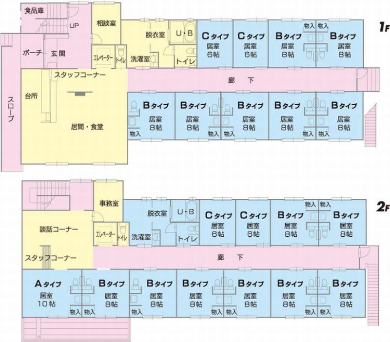 居間・食堂、車椅子対応トイレ、洗面台、浴室、台所、洗濯室、エレベーター、談話室、相談室、事務室、食品庫