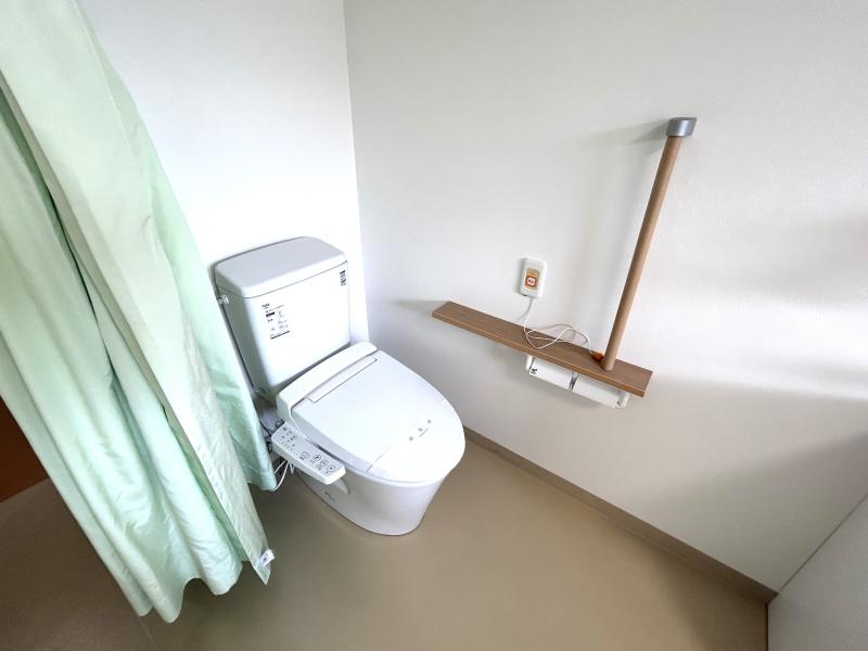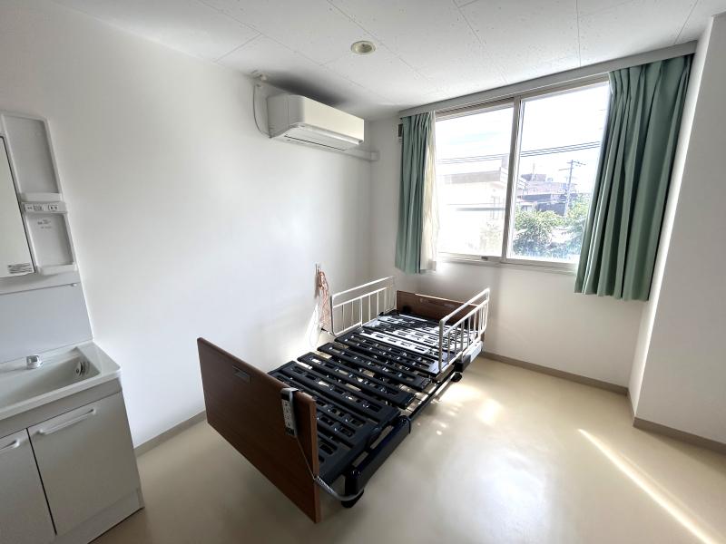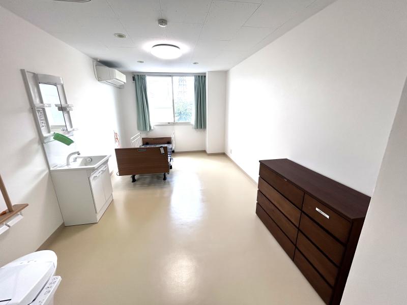 ナースコール、介護ベッド、テレビ回線、洗面台、エアコン、カーテン、冷暖房、ウォッシュレット付きトイレ、チェスト、照明機器