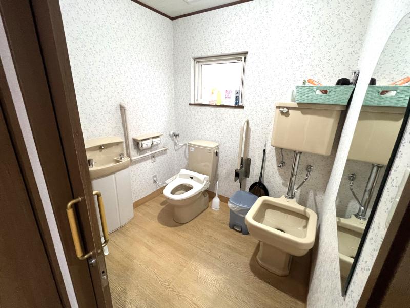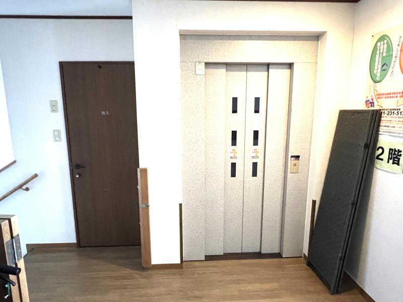 食堂、台所、居間、トイレ、車椅子対応トイレ、浴室、脱衣所、洗面所、洗濯室、和室、エレベーター、階段、事務室