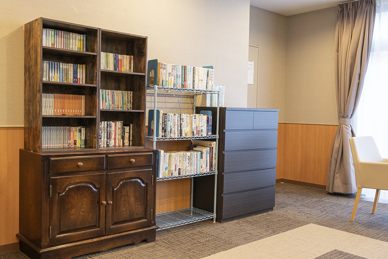 エントランス、ロビー、食堂(兼機能訓練スペース)、リビング、ラウンジ(読書スペース)、相談室、健康管理室、個浴室、機械浴室、脱衣室、温水洗浄機能付共用トイレ、ヘルパーステーション、エレベーター