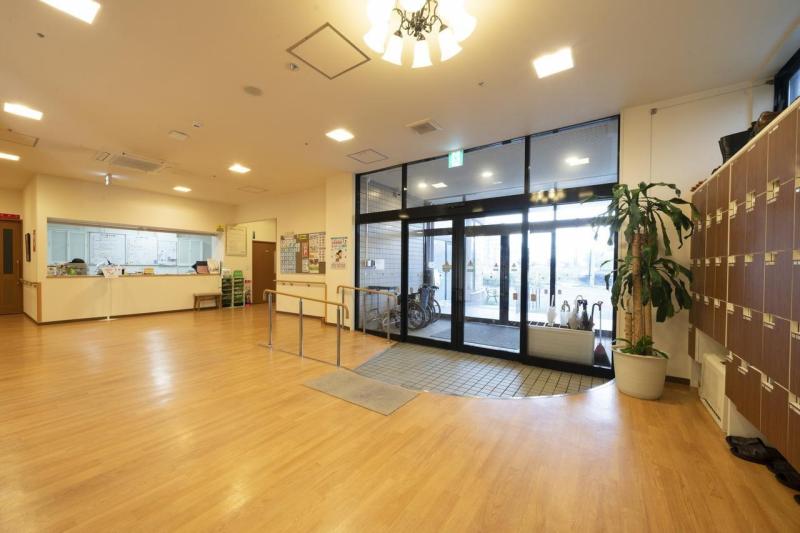 エントランス、ロビー兼談話コーナー、食堂(兼機能訓練スペース)、リビング、相談室、健康管理室、静養室、一般浴室、個浴室、機械浴室、脱衣室、洗濯室、温水洗浄機能付共用トイレ、ヘルパーステーション、エレベーター、花壇