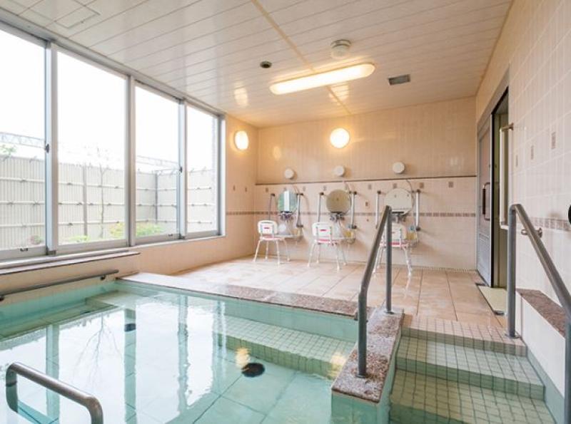 居室は、プライバシーに配慮した全室個室で、トイレ・洗面台・介護用ベッド・エアコンなどを完備しています。ドアはスライド式で開けやすく、バリアフリー設計で、車いすの方でも安心してお過ごしいただけます。ご自宅から愛着のある家具をお持ち込みいただくことも可能ですので、お気軽にご相談ください。浴室には、車いすの方でもご入浴いただける機械浴もご用意しています。